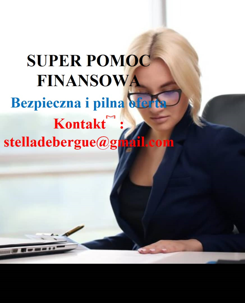 Super pilna pożyczkaWitam, oferuję certyfikowane pożyczki krótkoterminowe i długoterminowe bez żadnych formalności. Gwarancja satysfakcji w kilka minut!Skorzystaj z tej fantastycznej oferty, kontaktując się ze mną już teraz!Kontakt: stelladebergue@gmail.com